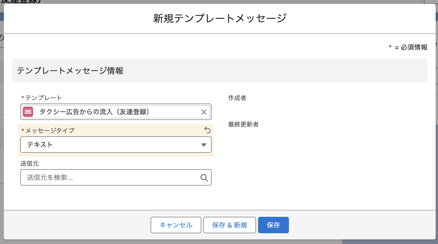 「テンプレートメッセージ」関連リストの[新規]より、テンプレートメッセージを作成します。