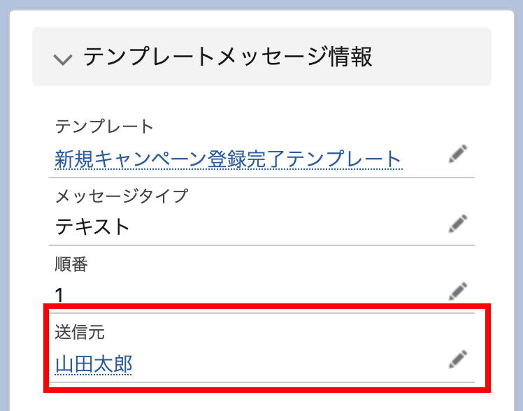 テンプレートメッセージオブジェクトの「送信元」項目で設定することにより、テンプレートを使用したあらゆる配信で使用することができます。