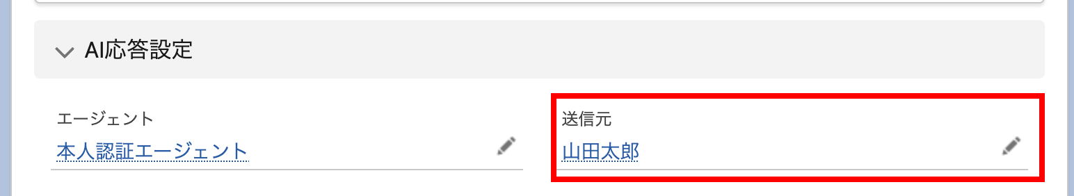 自動応答メッセージの種別を「エージェント」にしたときに表示される「送信元」項目で設定することにより、AI応答時に送信元をカスタマイズすることができます。